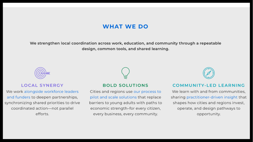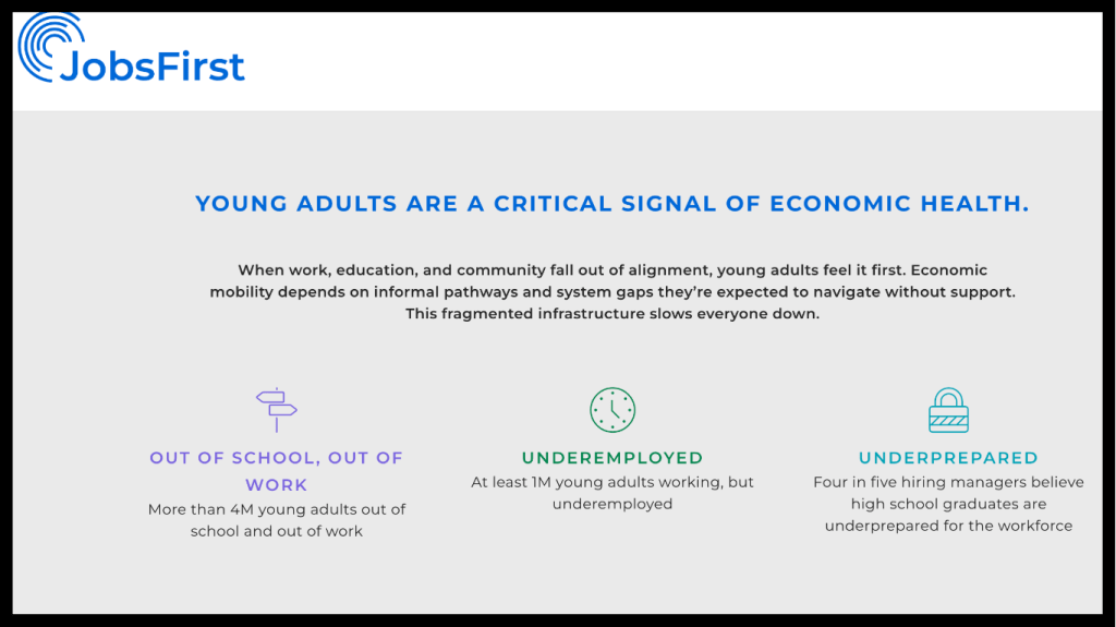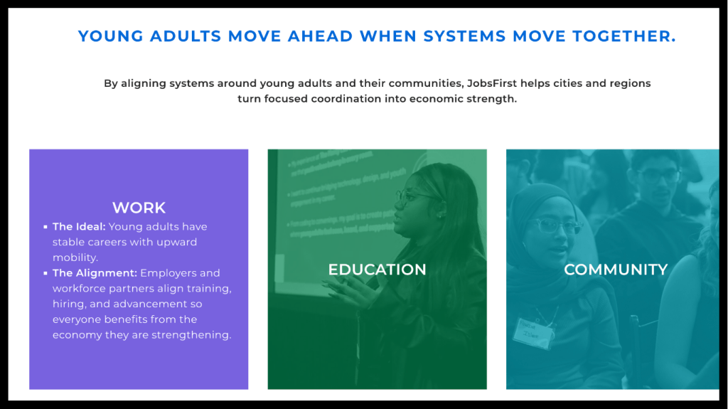 JobsFirst is a national organization built around a core idea: when work, education, and community systems align around young adults, everyone moves forward.