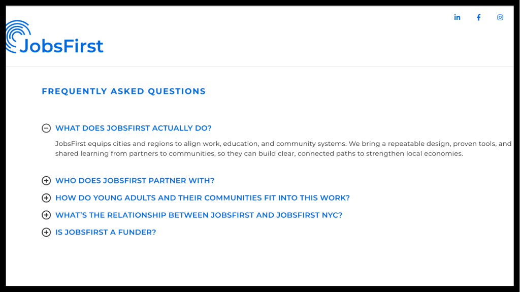 On the strategy side, I led the process of aligning JobsFirst leadership and their Local Driver partners around the core idea, which required facilitating conversations with people who have been deep in the work for years, and translating their insights back to them in language that makes sense to them—and their audiences.